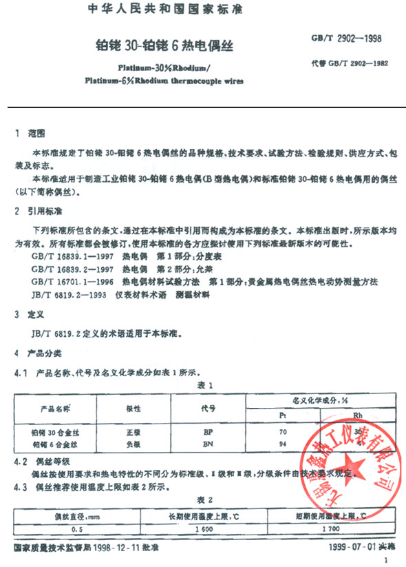 B分度号 铂铑30-铂铑6热电偶标准